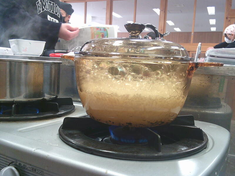 だしの香りに,「おいしそう~!」と大盛り上がりしていました。最後にみそを溶き入れると,さらにいい香りが広がり,「毎日食べたい!」と言っていました。お米が炊ける様子を横から見ることもなかなかので,興味深そうに見ていました。