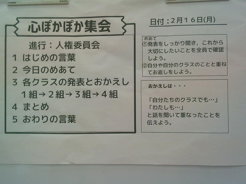 今月は人権教育月間です。今年度も残り2ヶ月。最後まで、自分もみんなも心がぽかぽかになるような学校生活が送れるよう、引き続き、子どもたちとともに人権教育を充実させていきたいと思います。