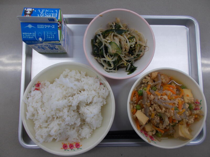 厚揚げのそぼろには、牛丼のような味付けで、ご飯が進みました。サラダもわかめたっぷりで、健康に良さそうでした。これから益々寒くなりますが、給食をたくさん食べて、元気に過ごしてほしいです。