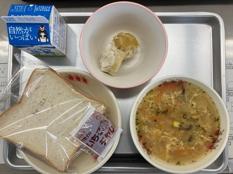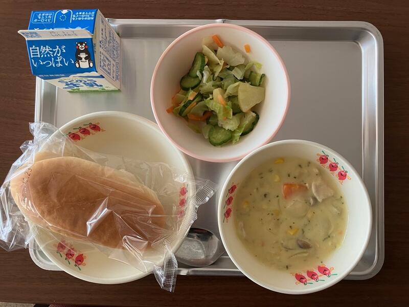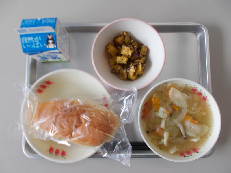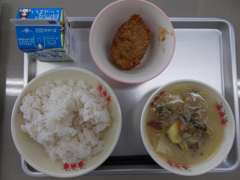 とんじるには、さつまいもとじゃがいもの2種類のいもが入り、食べ比べしながらいただきました。照り焼きチキンパティもおいしかったです。今日も完食、ごちそうさまでした。