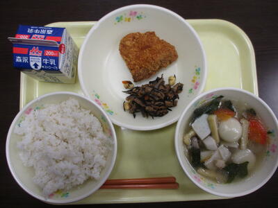 むぎごはん、おぞうに ぶりフライ、ひじきのいために
