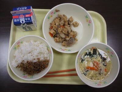 むぎごはん、かきたましる、さといものそぼろに、ちりめんナッツ