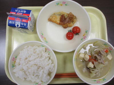 むぎごはん、ぶたじる、ホキのガーリックソースかけ、ミニトマト