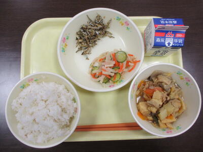 むぎごはん、あつあげのうまに、だいこんサラダ、ごまめ