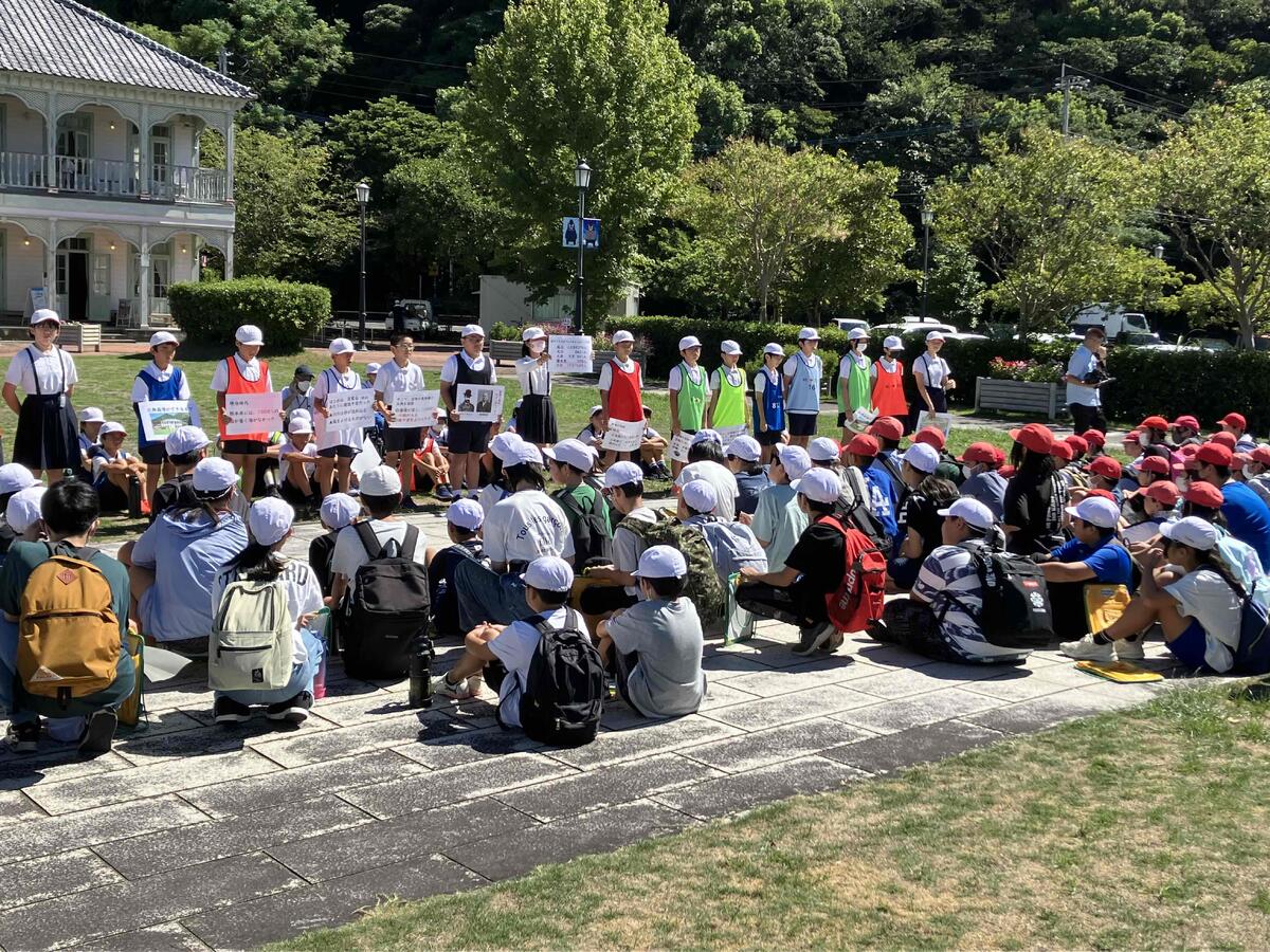 初めは緊張も見られましたが、大きな声や分かりやすい解説などを交えながら三角西港のそれぞれの施設を紹介することができました。万田小学校の6年生も楽しんで参加し、三角西港の歴史や各施設について学習していました。