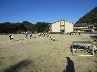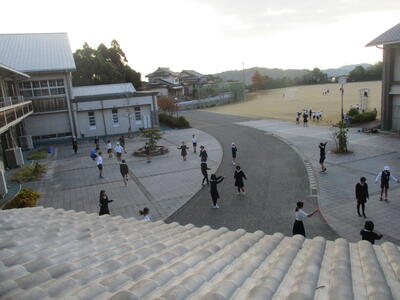 今朝の校舎から見下ろした写真です。子供たちがなわとびの練習をしています。私に気付いた子が、「校長先生、おはようございます。」とさわやかなあいさつをしてくれました。今日は金曜日、今日も一日がんばっていきましょう。