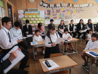 本日、6年生は荒尾市の万田小学校の6年生をお迎えして、世界遺産10周年を迎える三角西港をガイドしました。大きくはっきりとした声であいさつや説明をして、よくばんばっていました。荒尾市からわざわざ来てくださった万田小の皆さんもガイドに満足していただいたのではないでしょうか。
