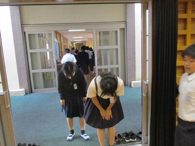 本日、児童集会(保健委員会発表)をしましたが、まず体育館に企画委員会や6年生が先に整列しています。そして、他の学年や職員が入ってきますが、入ってくる人に対して大きな声で「こんにちは」と言ってくれます。入ってきた児童はそれにお返しの「こんにちは」を言います。この繰り返しで、最後に入場した1年生に他の学年が、ほぼ全員で「こんにちは」とあいさつします。1年生もお返しの「こんにちは」を言います。もちろん、全員できているわけではありませんが、確実に校内でのあいさつは少しずつ少しずつ良くなってきています。