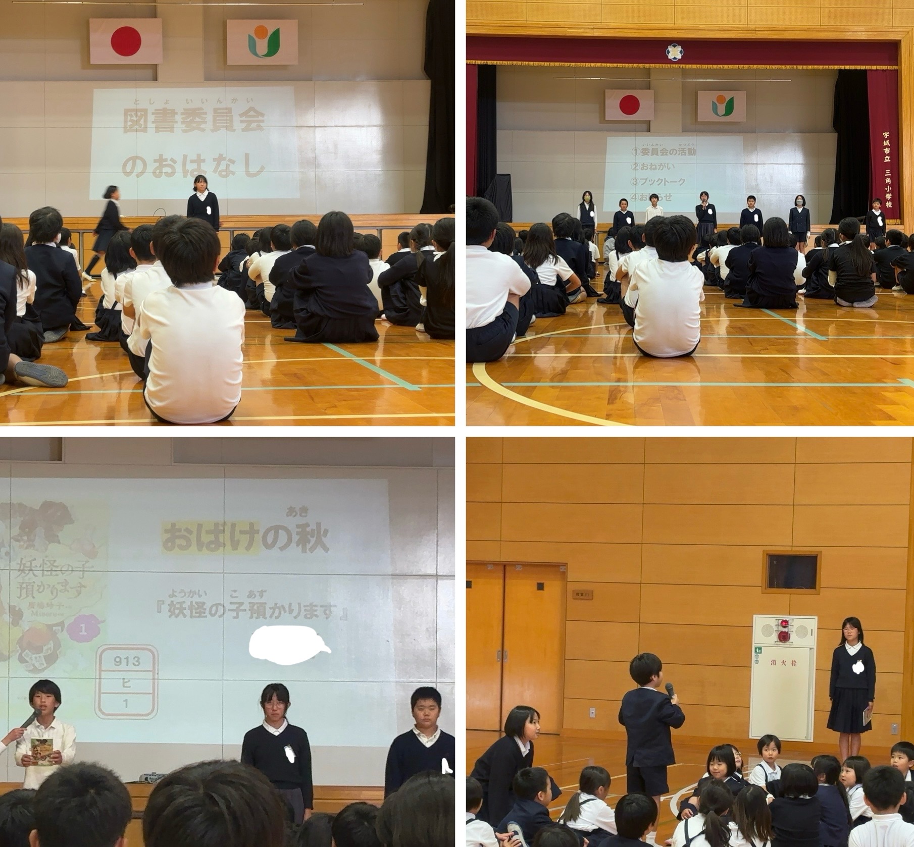 11月19日(水)に児童集会がありました。今回は図書委員会からの発表でした。活動内容の紹介だったり、おすすめの本の紹介だったりと盛りだくさんでした。児童のみなさん、これからもたくさん本を読んでくださいね。