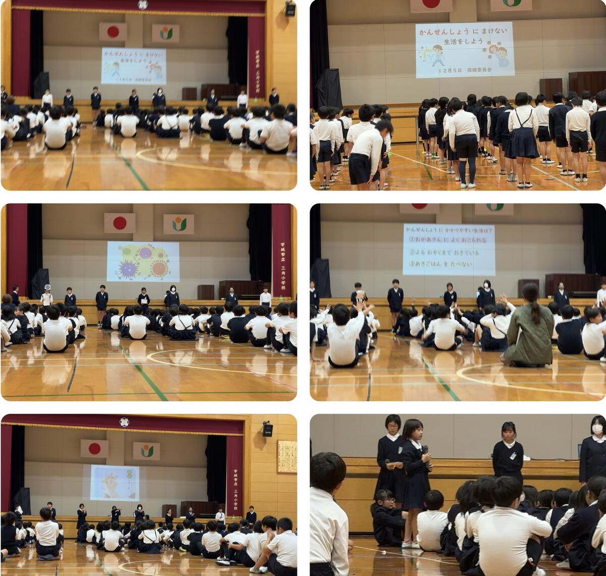 今日は、児童集会がありました。保健委員会からの発表で、感染症対策についての発表でした。子供たちが作成したビデオやクイズを見ながら、全校児童で楽しみながら学ぶことができました。