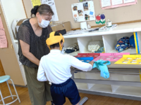 また、当日は引き渡し訓練がありました。大雨や土砂災害などが発生する恐れのある緊急的な状況になった際に、子ども全員を安全に確実に避難させるための訓練です。保護者の方々には、事前のアンケート調査、当日のお迎えなど多くの点でご協力いただきありがとうございました。ご協力のおかげで、スムーズな訓練の実施ができました。