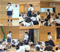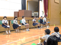 新入生歓迎会では、まず、1年生の自己紹介がありました。自分の名前や、好きな物、将来の夢を大きな声でみんなに発表していました。また、企画仲良し委員会が司会を務めるゲームもありました。「ジャンケン列車」「猛獣狩りに行こうよ」を全校児童で楽しみました。1~6年生まで混じり合い、楽しい時間でした。