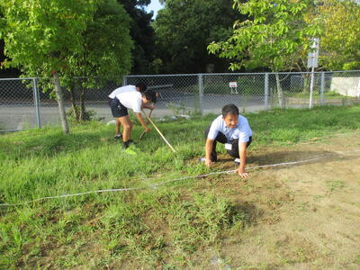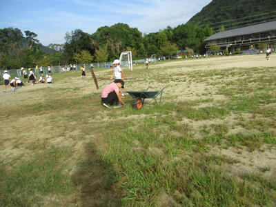 6年担任、本村先生もグランド整備 児童もお手伝い
