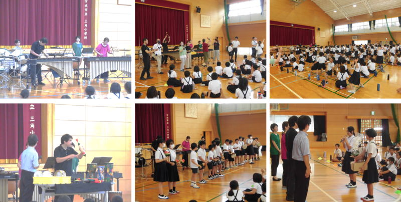 9月19日は、芸術鑑賞会でした。九州打楽器合奏団の方々をお招きし、三角小特別コンサートを開いていただきました。「カルメン」「つるぎのまい」などの曲だけでなく、「勇気100%」「にじ」「気球にのってどこまでも」など子どもたちに馴染みにある曲も披露していただきました。また、職員や子ども達が打楽器を演奏したり、ソーラン節を演奏に合わせて踊ったりと楽しい時間を過ごすことができました。