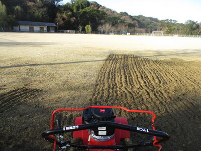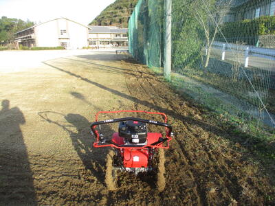 グラウンド周りの草や芝を根元から耕します。