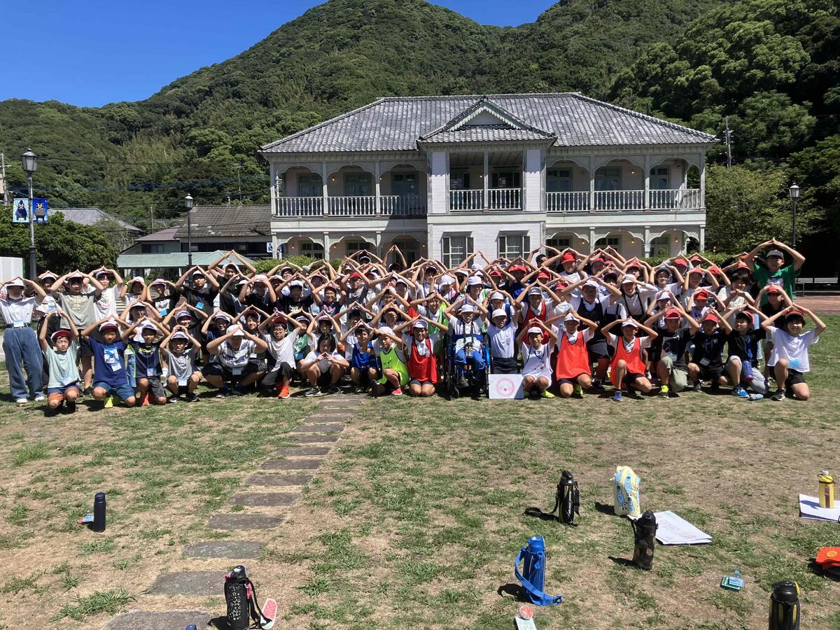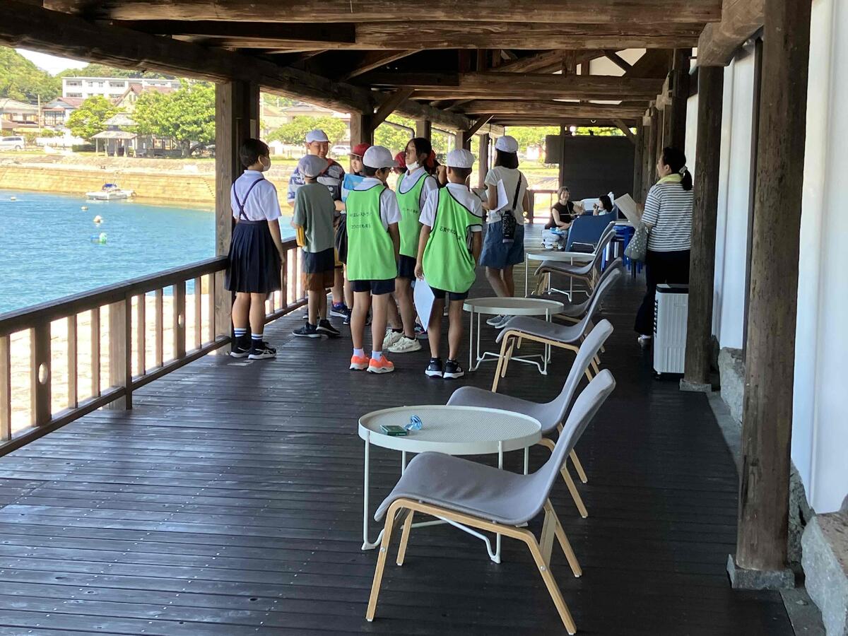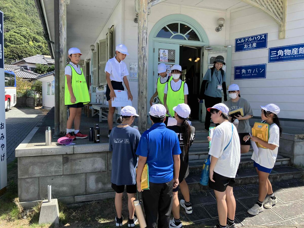 荒尾市立万田小学校の方々に三角西港に来ていただき、三角小学校の6年生が万田小学校の6年生に、三角西港をガイドしました。熊本県文化企画・世界遺産推進課の方や三角商事さんに協力を依頼して、オリジナルのビブスを作るなど、子供たちのアイデアによって計画を進めてきました。