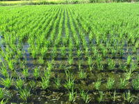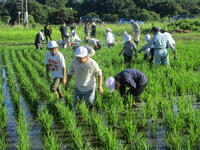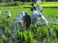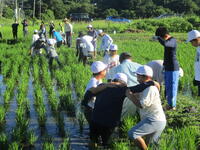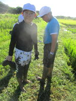 7月25日(金)朝、5年生は6:30に学校に集合し、スクールバスで戸馳の田んぼに行きました。(直接現地集合の子もいました)6月27日に植えた稲の苗もずいぶん大きくなっていました。その稲と稲の間に雑草が生えてきているので、その草取りが今日の目的です。7:00~7:30の短い時間でしたが、5年生は田んぼの端から端まで泥だらけになりながら汗びっしょりでがんばりました。