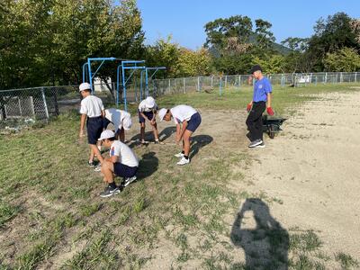 本日(9月3日)の朝、体育主任の山下玲於奈教諭が、幅跳びなどで使用する砂場やその周辺の草取りをしていました。感心しながら見ていたところ、6年生・3年生の男子がやってきて一緒に草取りをしてくれていました。8時前とはいえ太陽は煌々としています。みんな汗びっしょりでがんばってくれました。