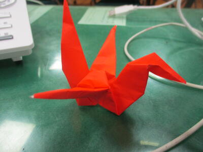 別の方に目をやると折り紙をしている子もいました。きれいな赤の折り鶴です。「じょうずだね。」と声をかけるとそれを惜しげもなく私にプレゼントしてくれました。嬉しい出来事でした。校長室に大切に飾っています。ありがとうございました!