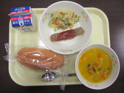 せわりコッペパン、パンプキンスープ、スティックドッグ、ゆずドレッシングサラダ