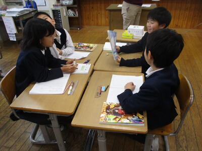 本日2時間目に、4年生で研究授業を行いました。国語の「日本語の数え方について考えよう」の説明文を使った授業です。今日のめあては、「あるものの新しい数え方を考え、理由とともに伝え合おう」でした。4年生は、グループ毎に「宿題・ほうき・牛乳・リコーダー・鉛筆」の数え方を考えていきました。鉛筆は普通一本、二本と数えますが、子どもたちは、鉛筆の形に目を付けて「一角丸、二角丸と数えます。理由は鉛筆には、丸や角のある形があるからです。」と形の特徴を捉えた数え方を考え出していました。子どもたちのいろいろな発想に感心させられました。授業者の栗﨑先生、お疲れ様でした。