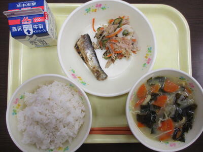 むぎごはん、さつまいものみそしる、いわしのしょうがに、やさいのうめこんぶあえ