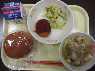 まるパンカット、はるさめとにくだんごのスープ、コロッケ、コールスローサラダ