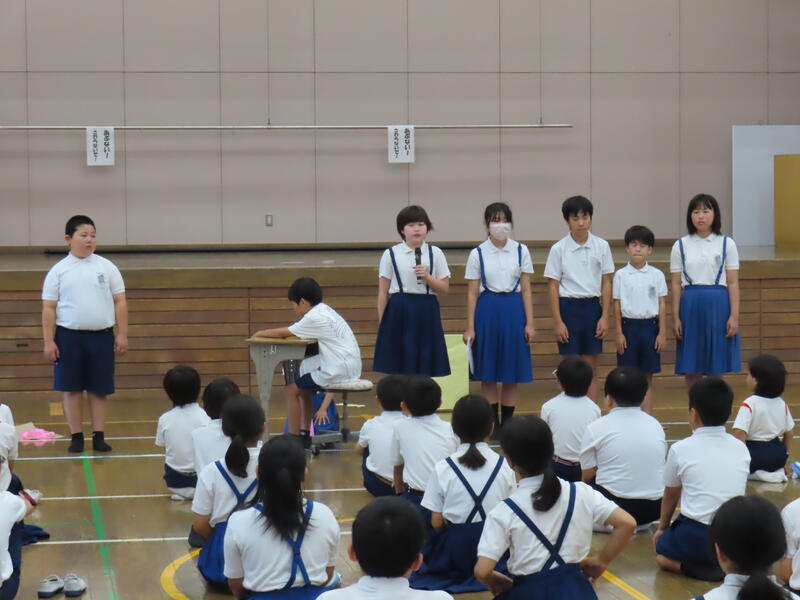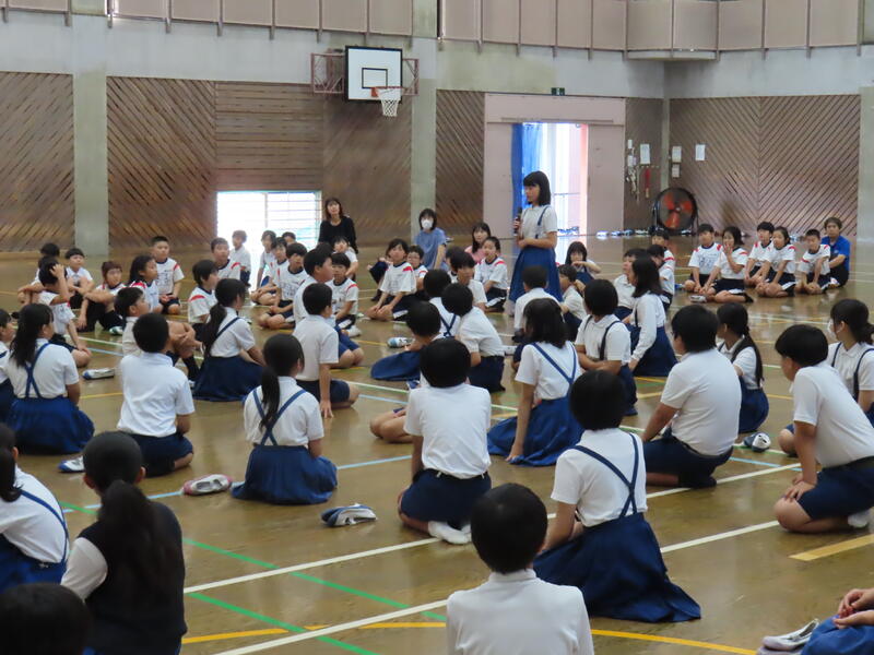 12月2日(火)に全校集会がありました。校長講話では、「伝えること、表現すること」について話がありました。最初に今年の夏休みにグローバルジュニアドリームの引率で台湾へ行かれた先生の話がありました。その中で、言語が違っても、自分のことや自分の考えを伝える大切さについて経験談を交えて話されました。その後、校長先生から10月から11月に行われたビブリオバトルを例に、話すことや聞くことの大切さやポイントを紹介されました。児童がお二人の先生方の話をしっかり聞いている姿が大変印象的でした。