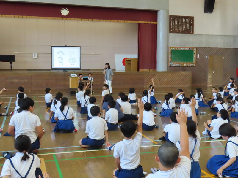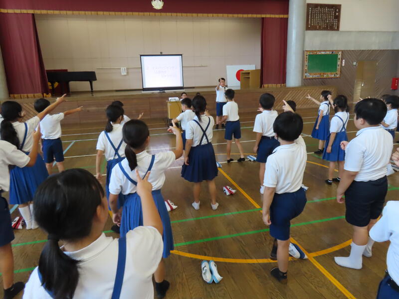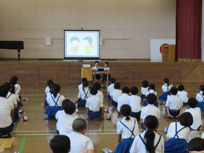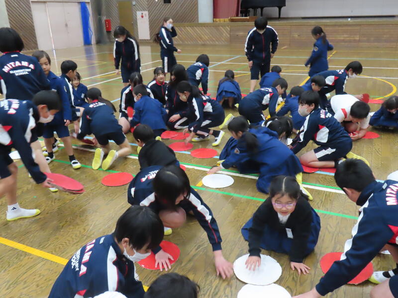 2月18日(水)に「にこにこ集会」がありました。今回の「にこにこ集会」では、2つの縦割り班がチームとなって「風船運びリレー」を行いました。2人が向かい合わせた間に風船を置き、リレー形式で着順を争いました。人数が足りない班は上級生が2回行ったり、先生方に声を掛けてリームに入ったりするなど、相手のことを考えて行動する姿がうかがえました。児童の感想では、「縦割り班の中でみんなと協力できたのが楽しかったです。」「風船運びリレーでは負けてしまったけれど、みんなで盛り上がることができました。」などの声が聞かれました。