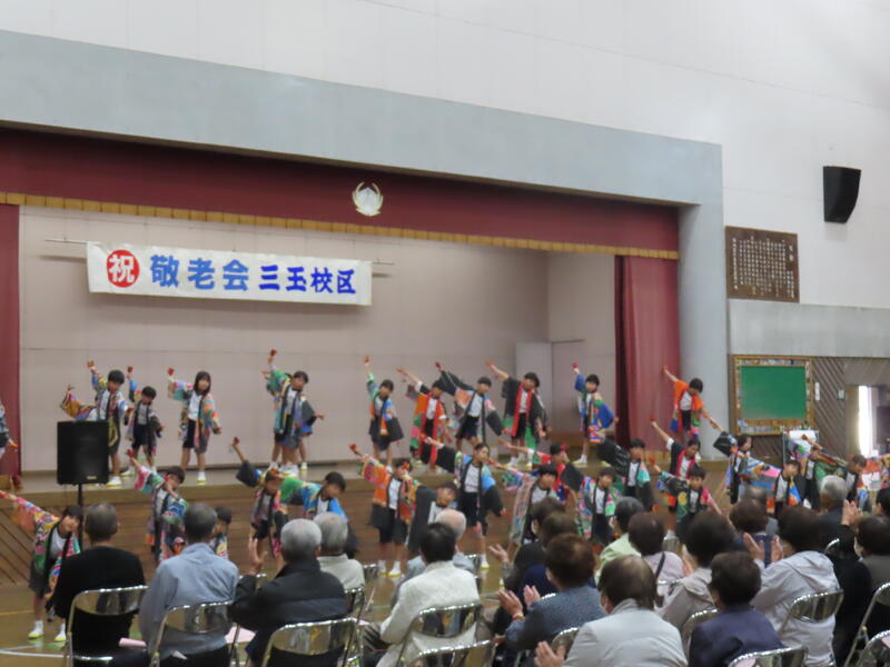 11月1日(土)に三玉校区の敬老会が三玉小学校体育館で行われました。本校からは3・4年生が代表として、敬老会のお祝いに三玉小学校創立150周年記念ソング「ハピネス」と運動会で踊った「ソーラン節」を披露しました。敬老会でおじいちゃん、おばあちゃん達を喜ばせたい一心でこれまで練習を頑張ってきました。本番では体育館中に歌声が響いたり、ソーラン節の熱気が会場全体に広がったりするなど温かい雰囲気で発表を終えることができました。3・4年生一人一人がしっかり頑張った敬老会での発表でした。