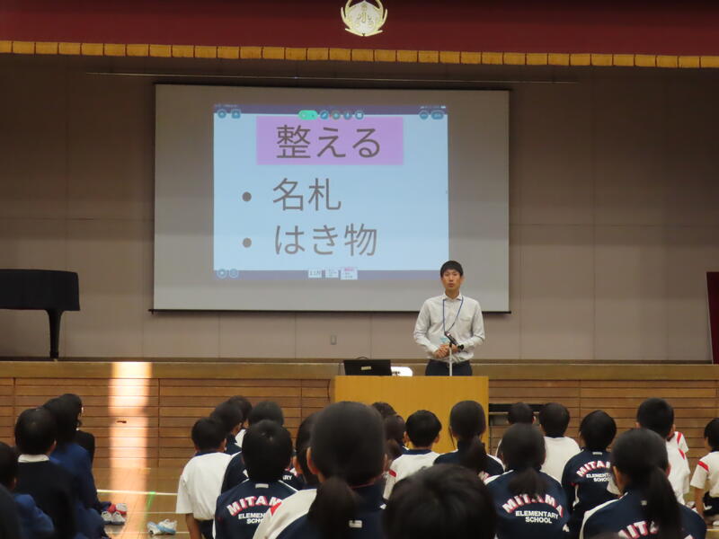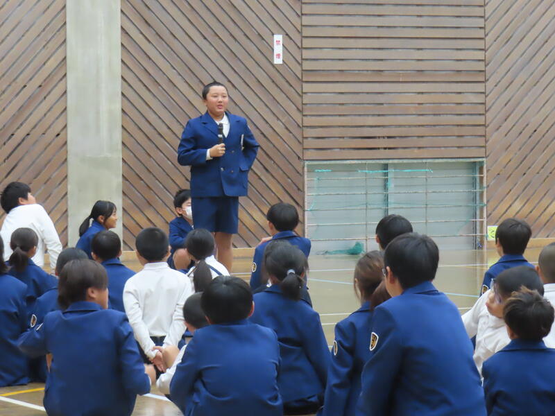11月6日(木)に校長講話がありました。校長講話では、山鹿市の小中学校に食材を寄付されている元田さんの話から、感謝することや見えないところで頑張る大切さ等について話がありました。頷きながらしっかり話を聞いている子どもたちの様子がうかがえました。また、生徒指導担当の話では、名札や履きものを整えることの確認がありました。