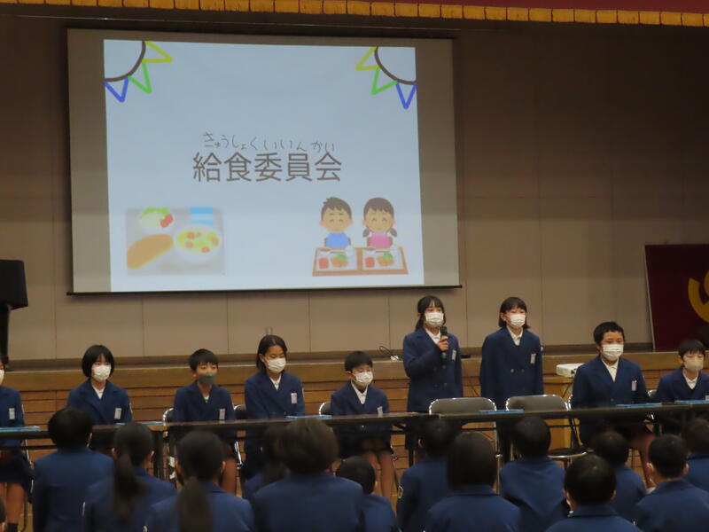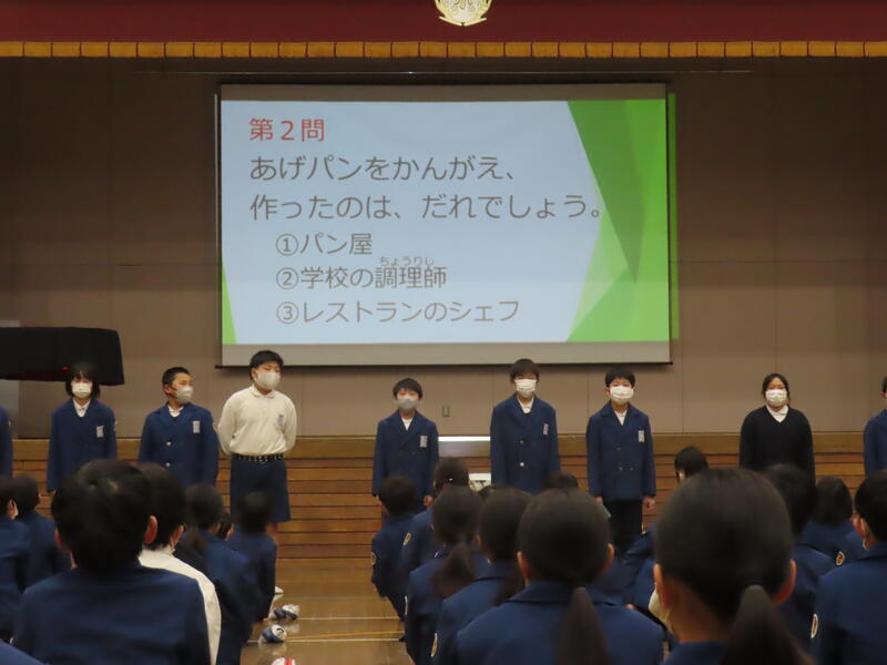 1月29日(木)に児童集会を行いました。今回の児童集会は、給食委員会による発表でした。発表は、給食に関するクイズと動画の紹介でした。給食に関するクイズでは、給食の歴史や三玉っ子が大好きな揚げパンがどのようにして誕生したのかを3択で出題し、答えが出るとみんなで盛り上がりました。動画では、三玉小学校の給食の先生方4名がどのように給食を作っているのかを視聴し、先生方の苦労や工夫を知ることができました。児童からは、「これから給食や給食の先生方にもっと感謝しながら食べたいです。」との感想があり、三玉っ子みんなで給食についてしっかり考える時間となりました。
