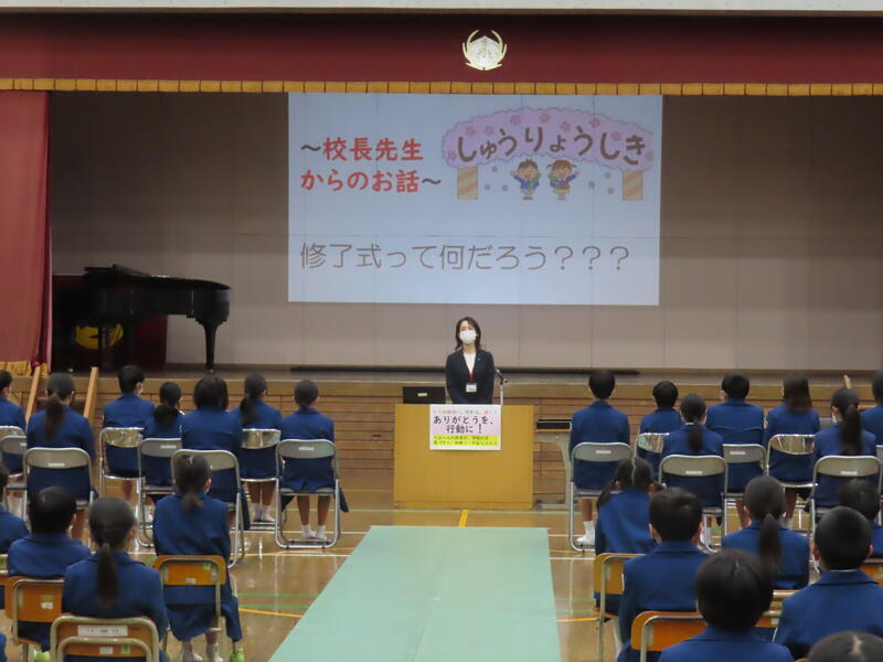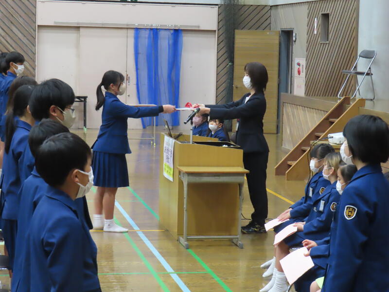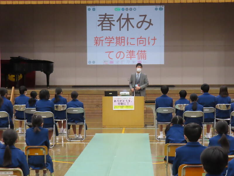 3月23日(月)に修了式を行いました。読書感想画コンクールなどの表彰の後、各学年の代表者に校長先生から修了証が渡されました。その後、各学年の代表者の作文発表がありました。作文発表では、この1年間に頑張ったことや心に残ったこと、来年度の目標などを堂々と発表してくれました。校長先生からの話では、この1年間を振り返るとともに、三玉っ子の姿をたくさん褒められました。さらに春休みの過ごし方や来年度更にパワーアップしていこうという話がありました。また、保健や生徒指導担当からの話では、病気の治療を済ませることや安全に過ごすためのきまりの確認、春休み中も規則正しい生活を送ろうという話がありました。