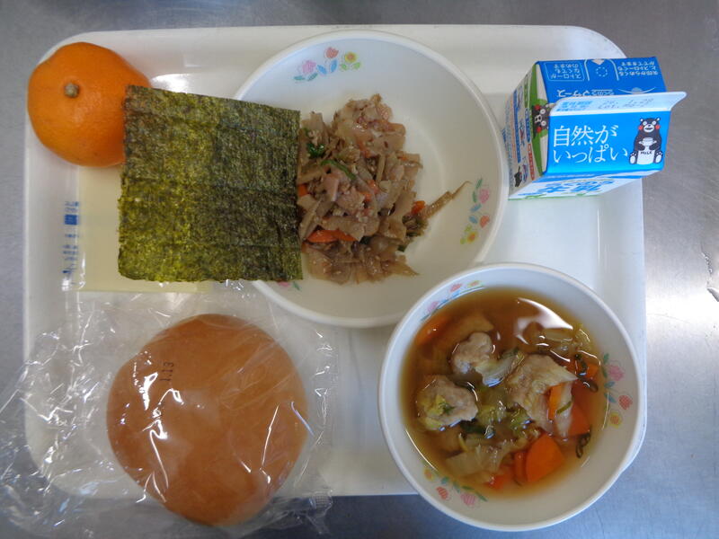 セルフきんぴらバーガー 牛乳 つみれ汁 みかん