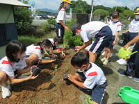 2年生は、ミニトマトの苗を植えました。毎日、朝から水かけを頑張っています。もう、既にお花がつき始めた人もいます。「かわいい花だなぁ。」「早く実がなるといいなぁ。」等と話ながらお世話にしていました。