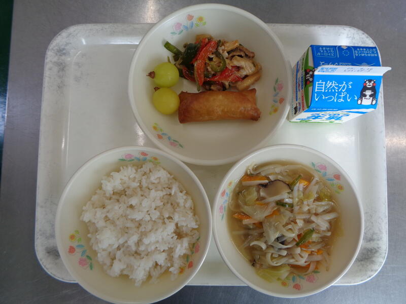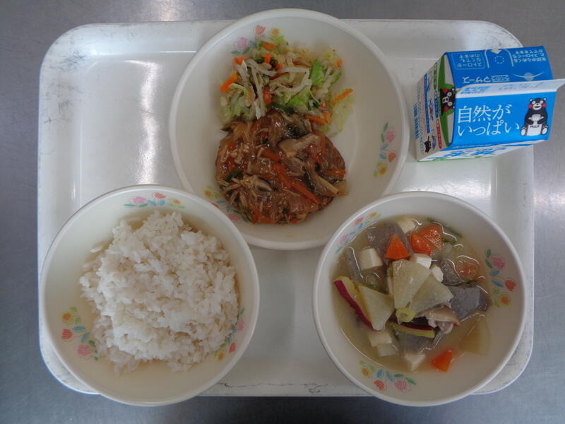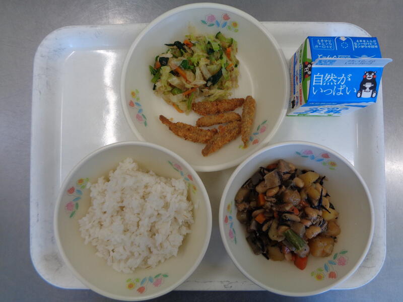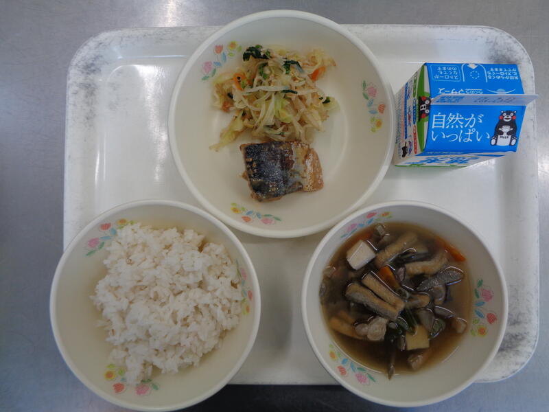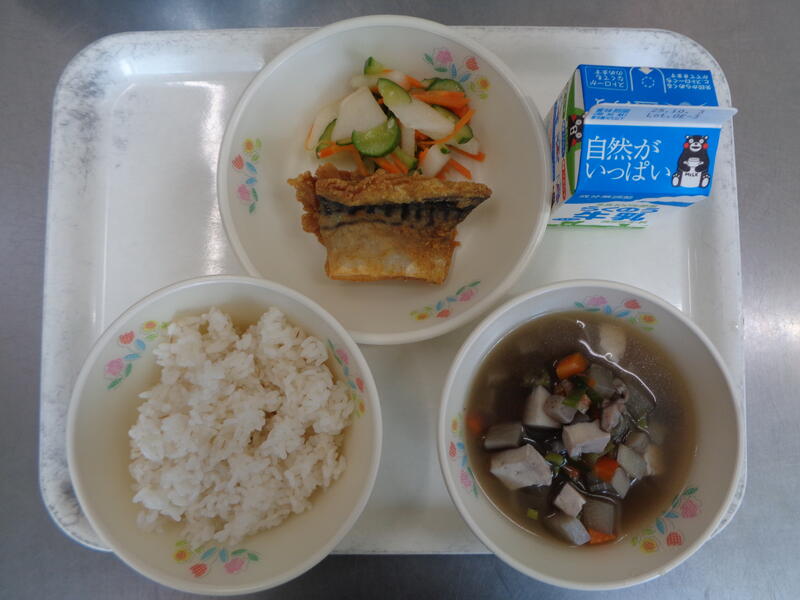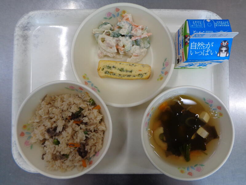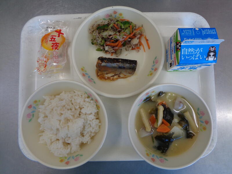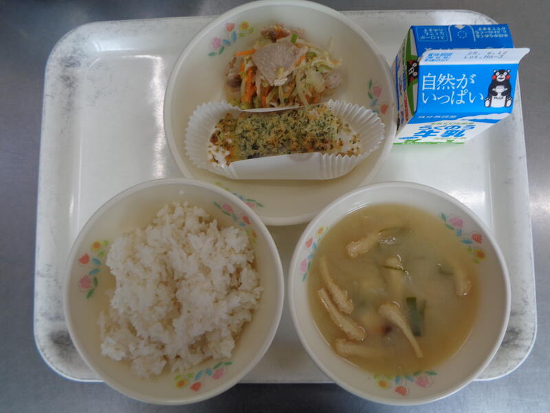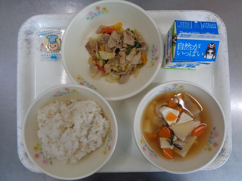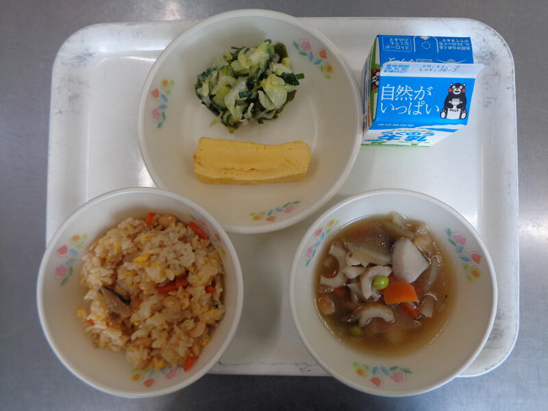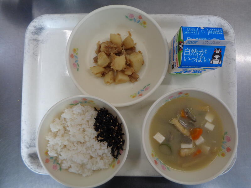 今週は、立山さんのお家からいただいた「森のくまさん」という種類の新米を使います。「森のくまさん」というお米は、お父さんが「コシヒカリ」お母さんが「ヒノヒカリ」という種類のお米で熊本県が開発したお米です。三玉小学校のみなさんは色々なお米の種類を食べることができて幸せですね!感謝していただきましょう!
