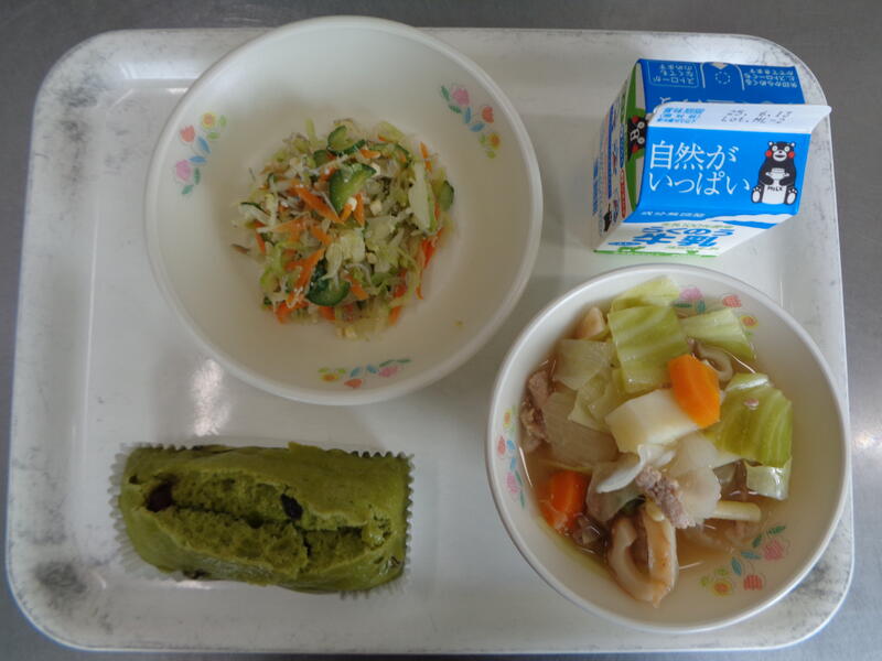 抹茶蒸しパン 牛乳 豚肉と野菜の煮込み かみかみチーズサラダ