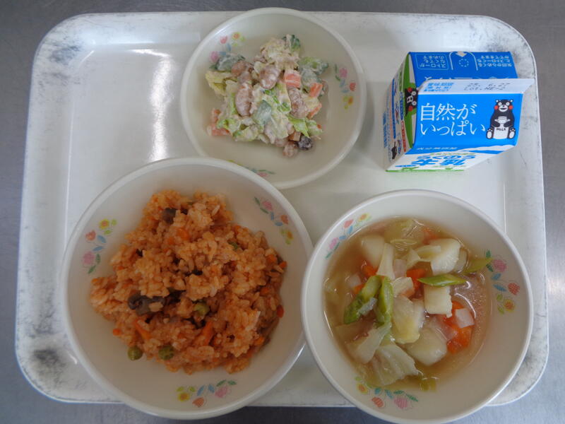 チキンライス 牛乳 野菜スープ ビーンズサラダ