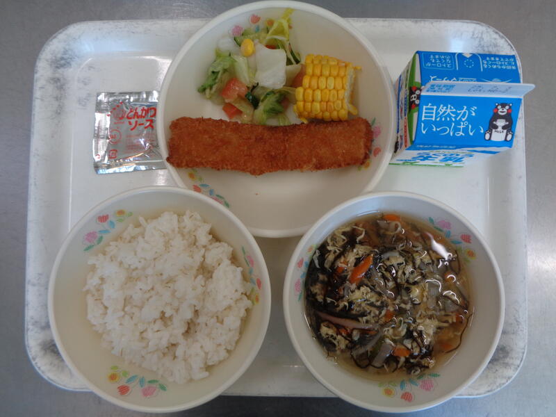 麦ご飯 牛乳 海のお野菜スープ 太刀魚フライ サラたまドレッシング とうもろこし