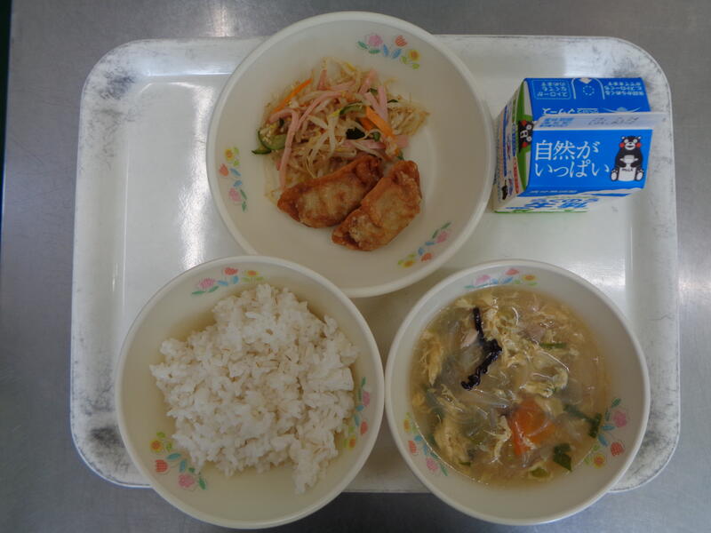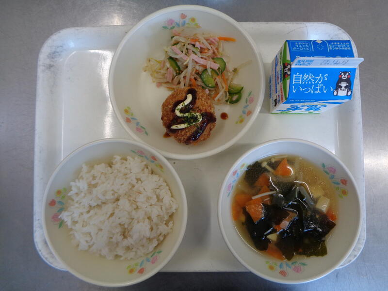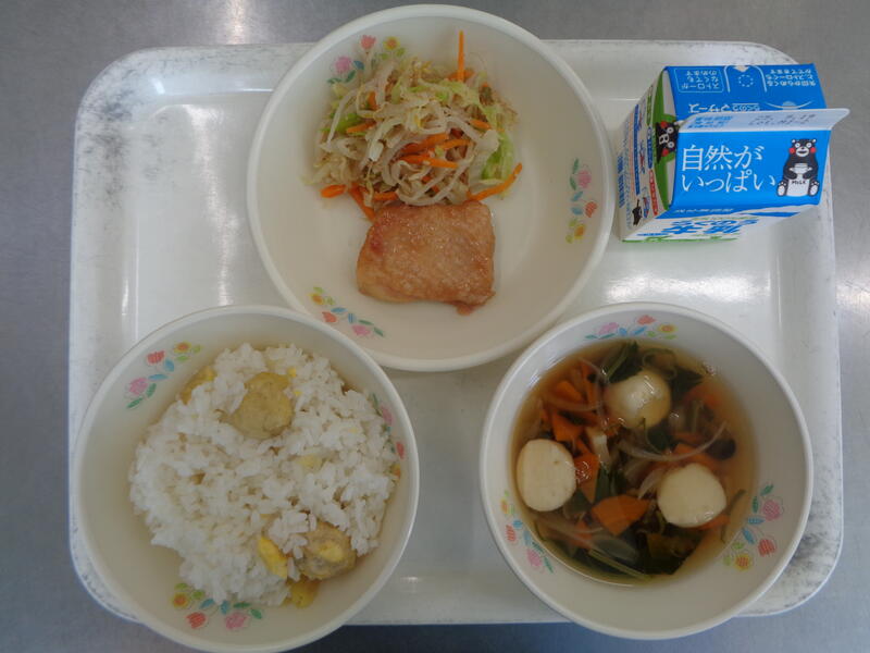 麦ご飯 牛乳 わかめスープ たこ焼きフライ もやしのナムル