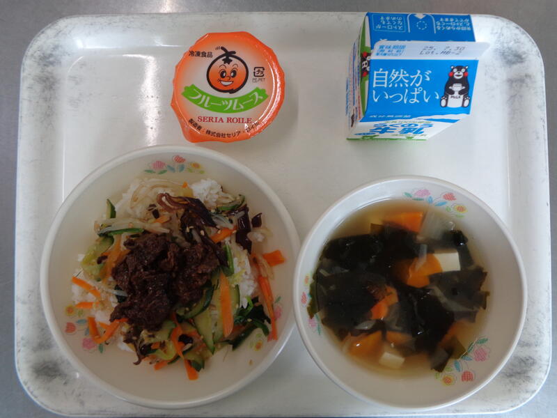 キムたくごはん 牛乳 スーミータン バンバンジーサラダ フルーツムース