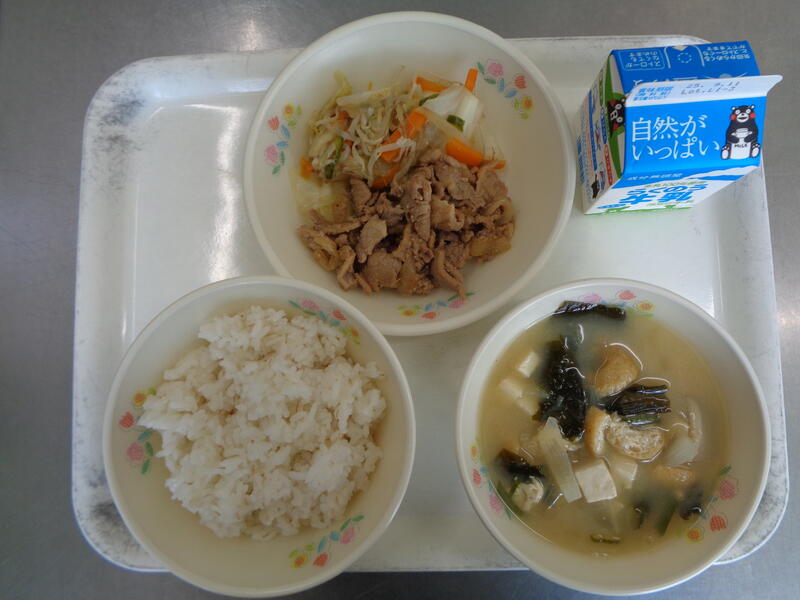 麦ご飯 牛乳 豆腐汁 肉野菜炒め チーズ