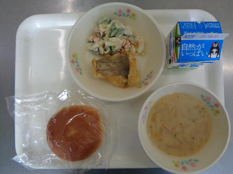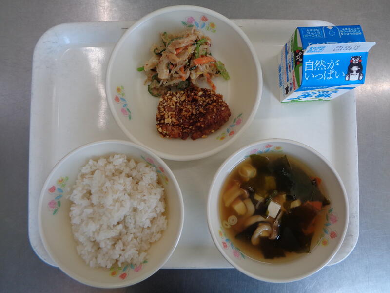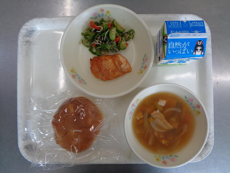ミルクパン 牛乳 かぶのスープ 鶏肉のコーンフレーク焼き 豆とわかめのサラダ