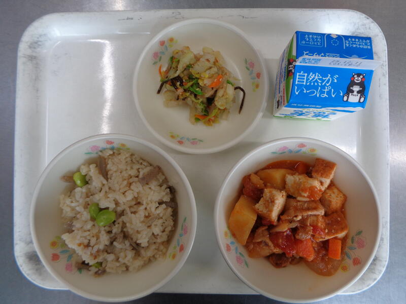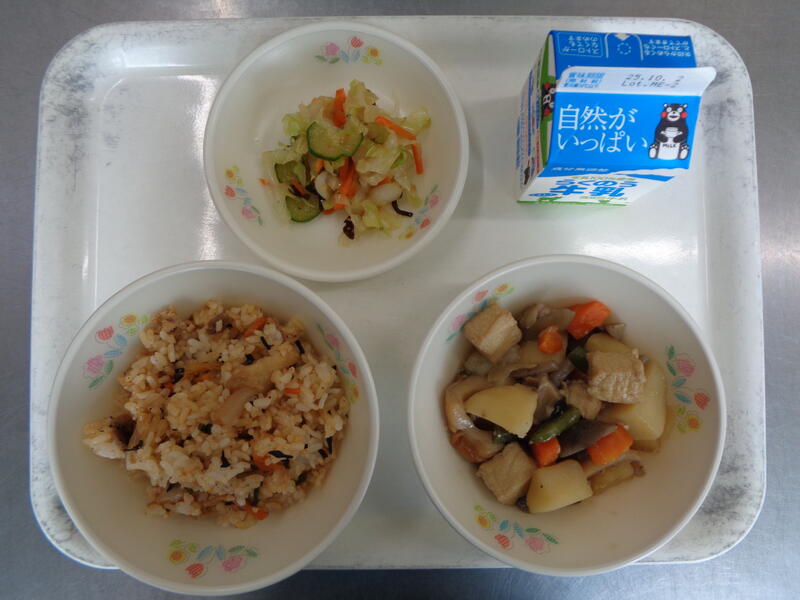 かしわ飯 牛乳 トマト入り肉じゃが 白菜漬け