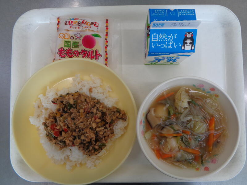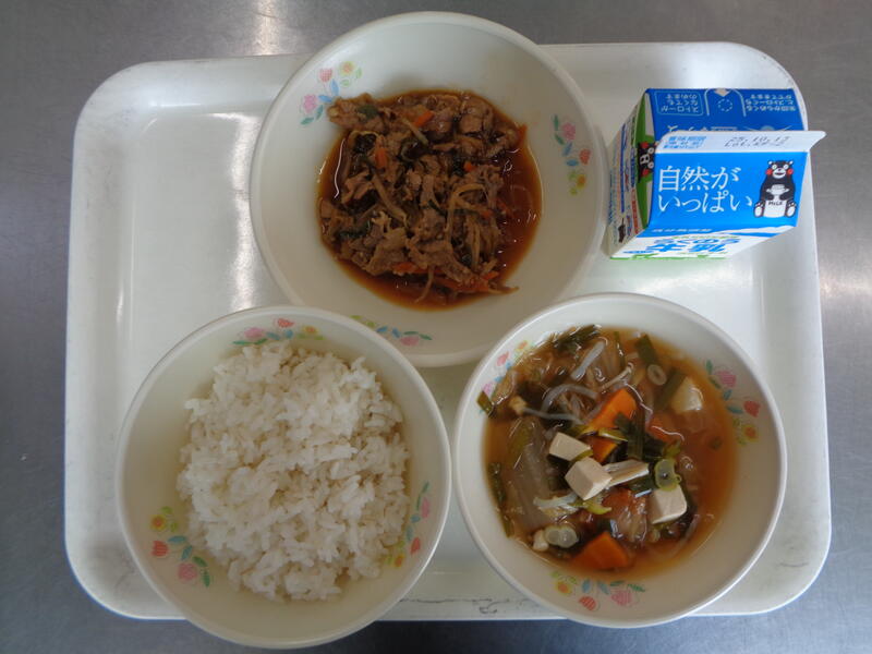 ごはん 牛乳 チンゲン菜と卵のスープ チャプチェ デザート