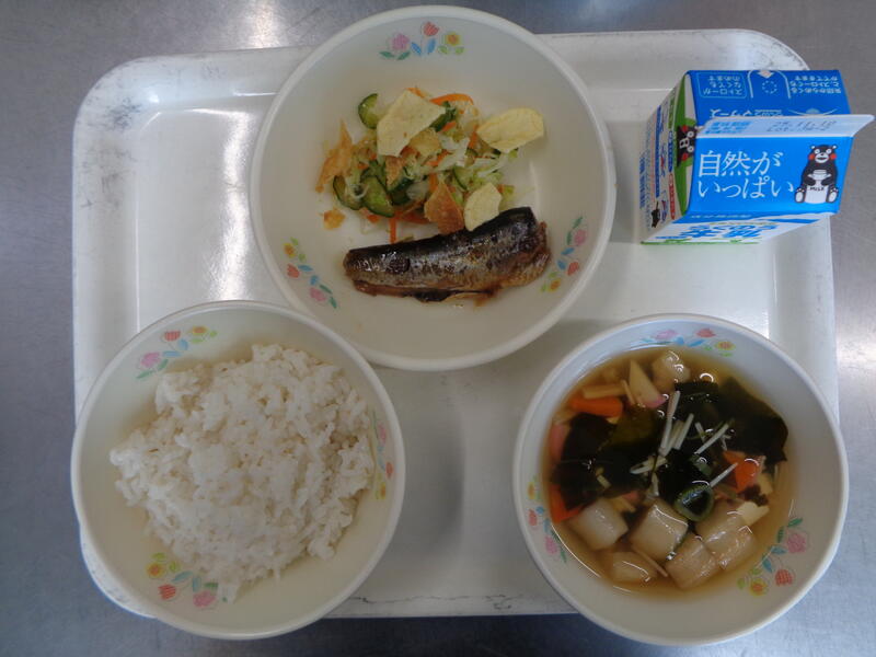 麦ご飯 牛乳 かきたま汁 いわしの生姜煮 かりかり和え