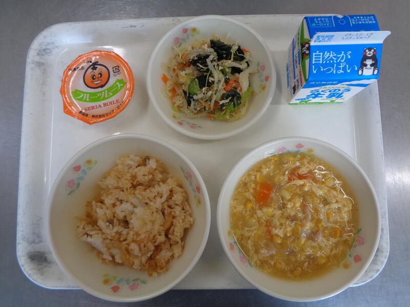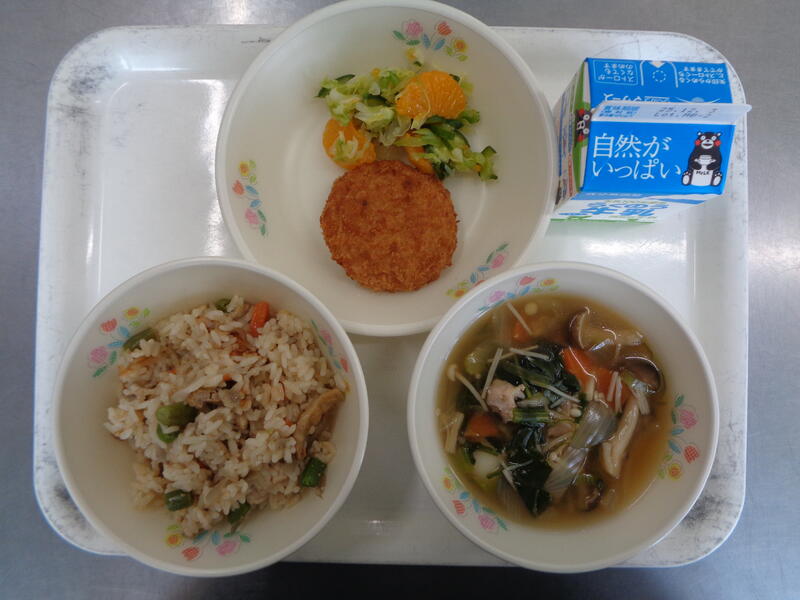 びりん飯 牛乳 白玉入りきのこ汁 れんこんのはさみ揚げ みかんサラダ