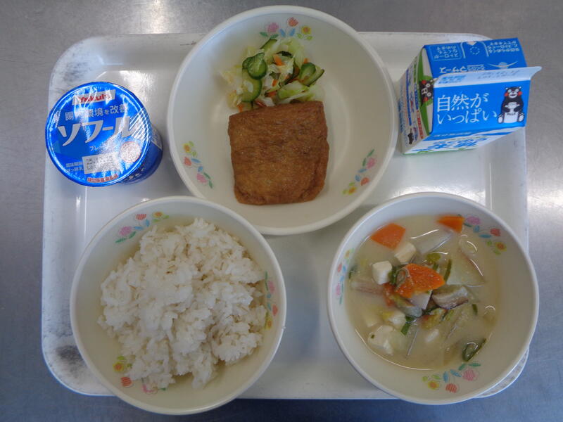 麦ご飯 牛乳 豆乳みそ汁 肉詰めいなりの甘辛煮 野菜の梅肉和え ヨーグルト