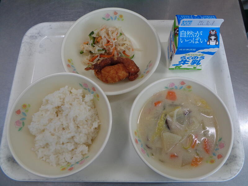 麦ご飯 牛乳 豆乳みそ汁 鶏の唐揚げ 白酢和え