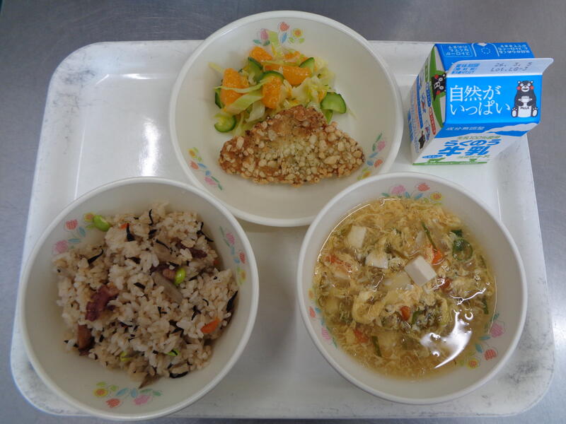 たこめし 牛乳 めか卵汁 真鯛の天玉揚げ みかんサラダ
